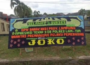 Salah satu karangan bunga yang menarik perhatian bertuliskan, “Selamat dan Sukses, Apresiasi Tekab 308 Polres Lampung Timur Berantas Premanisme Pelaku Pemerasan.”